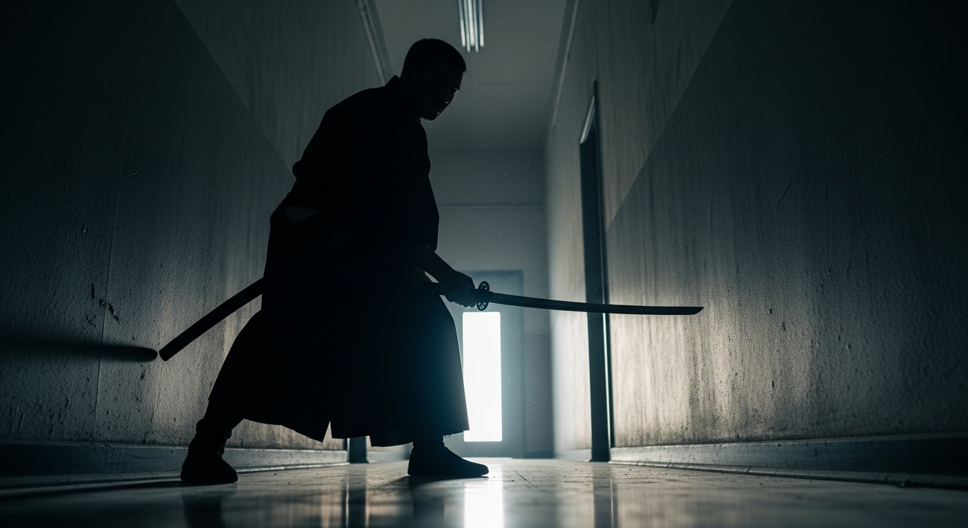 사건 당일, 그는 집 벽에 걸린 장식용 일본도를 들고 나왔다.