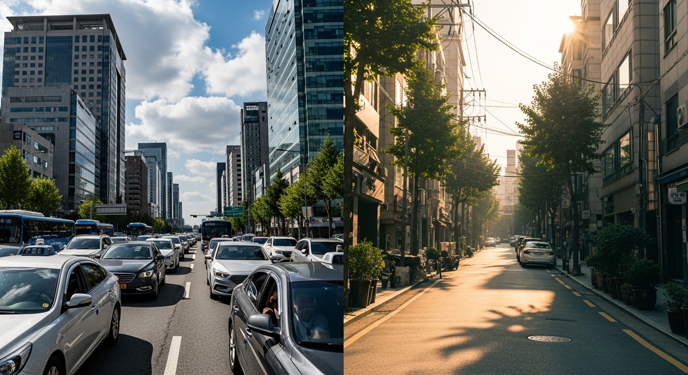 햇빛에 잠시 눈을 찡그리던 행인들, 정지된 신호 앞의 차들, 그리고 조용히 멈춰 선 시간.
