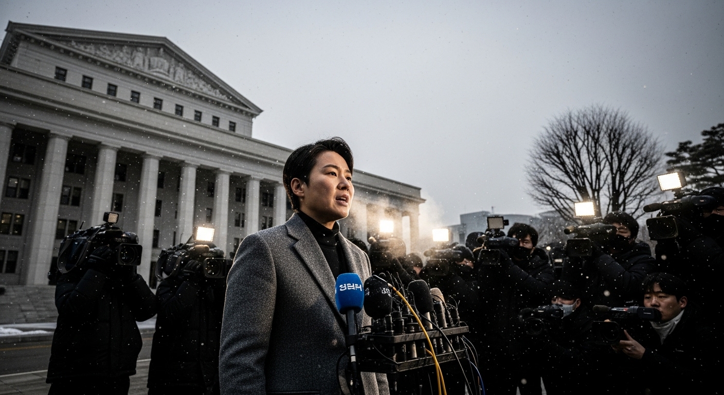 플래시가 터질 때마다 차가운 공기가 흔들렸고, 기자들의 펜 끝이 잔잔히 떨렸다.
